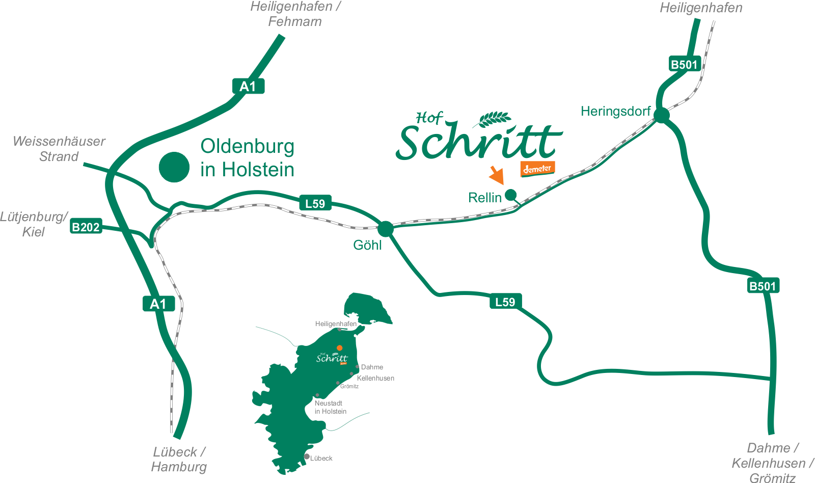 Aus Oldenburg in Holstein auf der Straße L59 kommend folgen Sie bitte den Schildern Richtung Göhl. Gleich nach Überquerung des Bahnübergangs in Göhl biegen Sie links ab Richtung Heringsdorf. Nach zwei Kilometern liegt das Dorf Rellin auf der linken Seite. Am Ortseingang ist der Hof durch Holzschilder mit grüner Aufschrift ausgeschildert.
